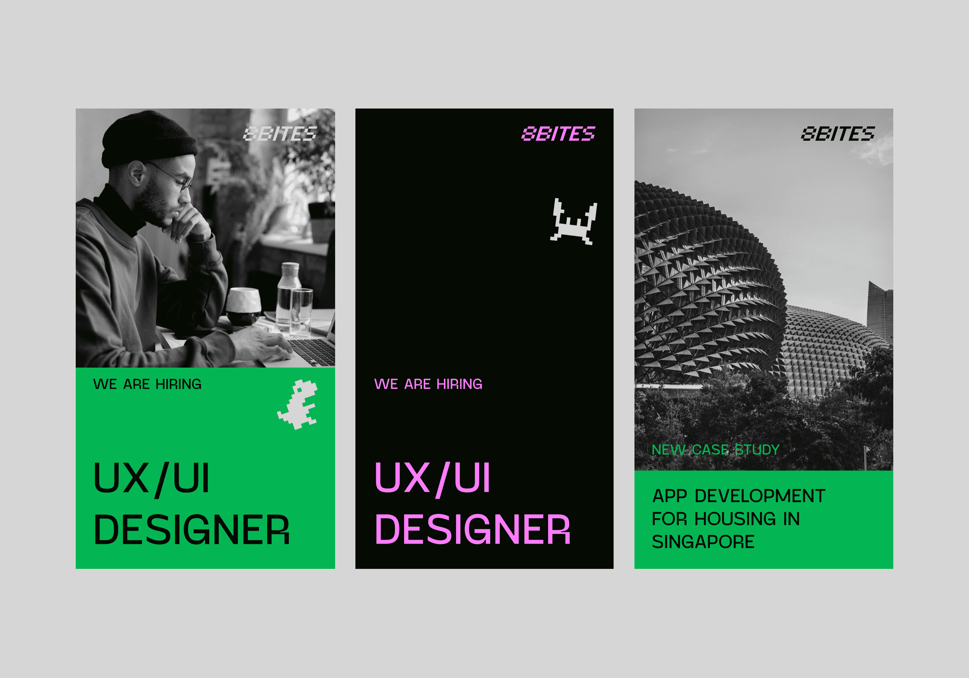 Inspired by 8-bit graphics and 90s games, we developed a personalized visual language for team members, along with an iconography used throughout brand communications. These characters, designed on a 12x12 grid, are complemented by line art illustrations of Sandwich, who explains the client's work process on the website.