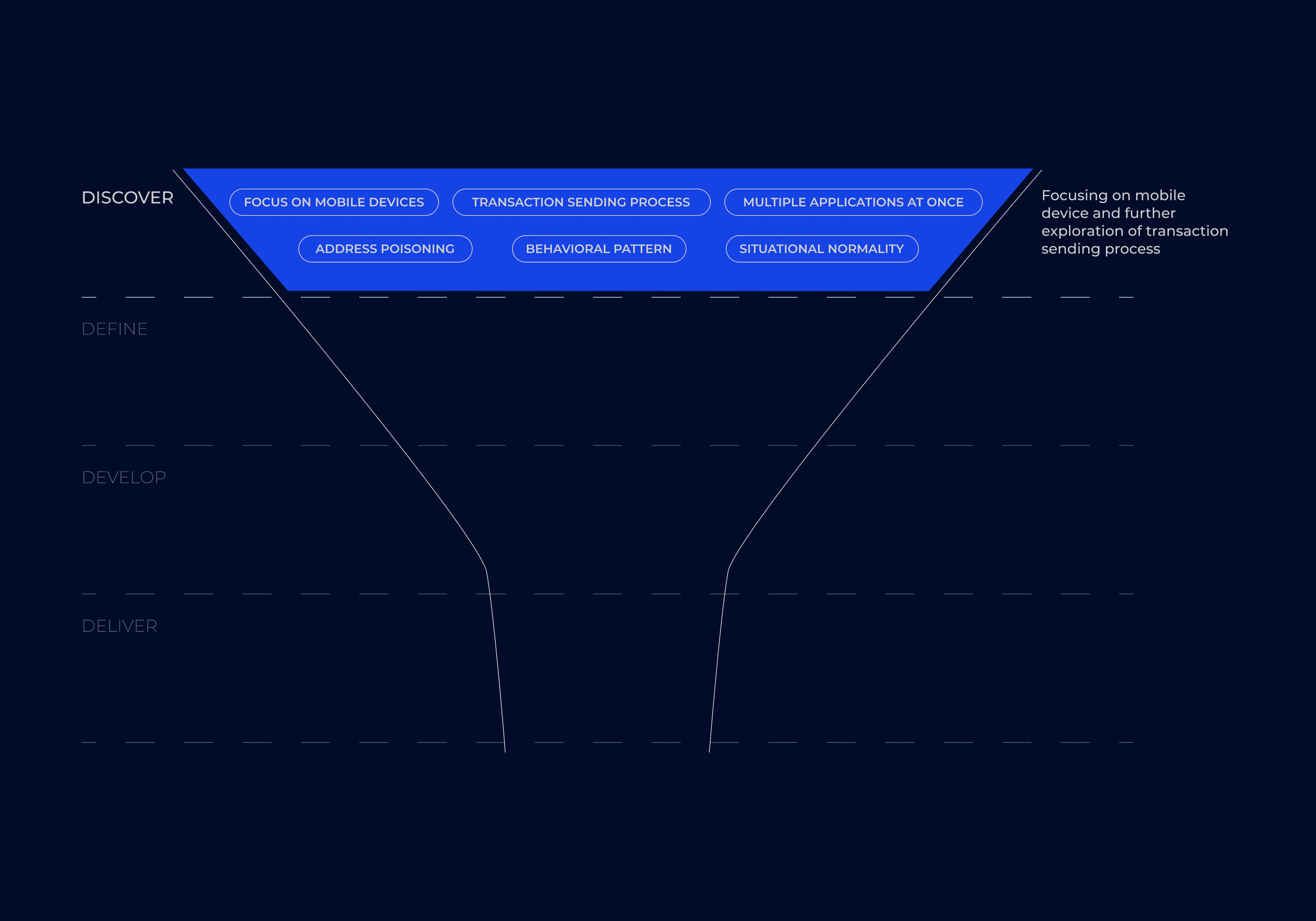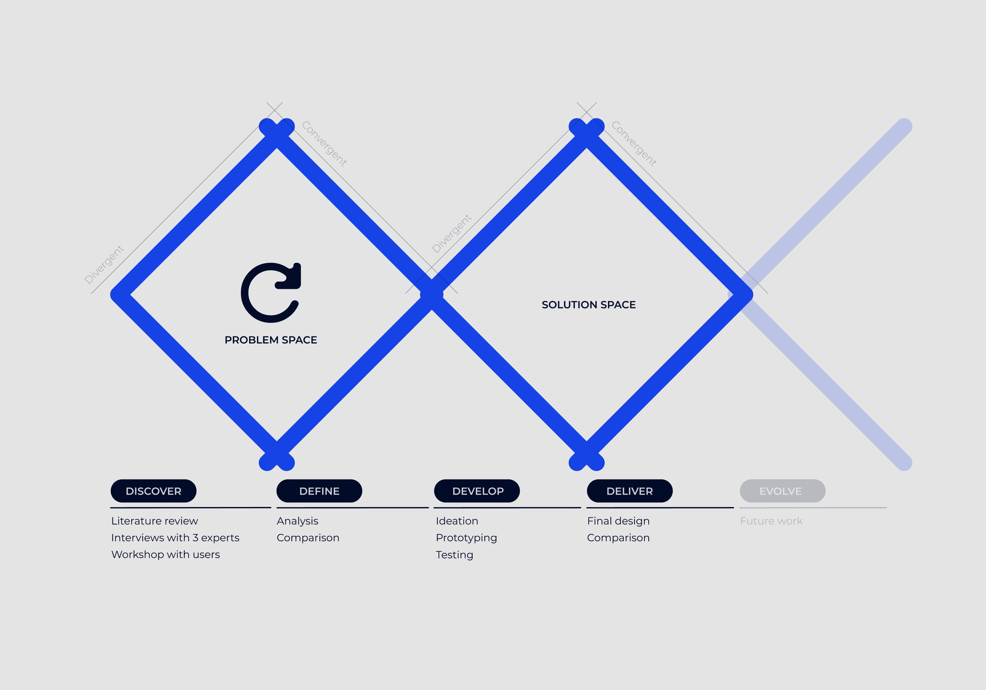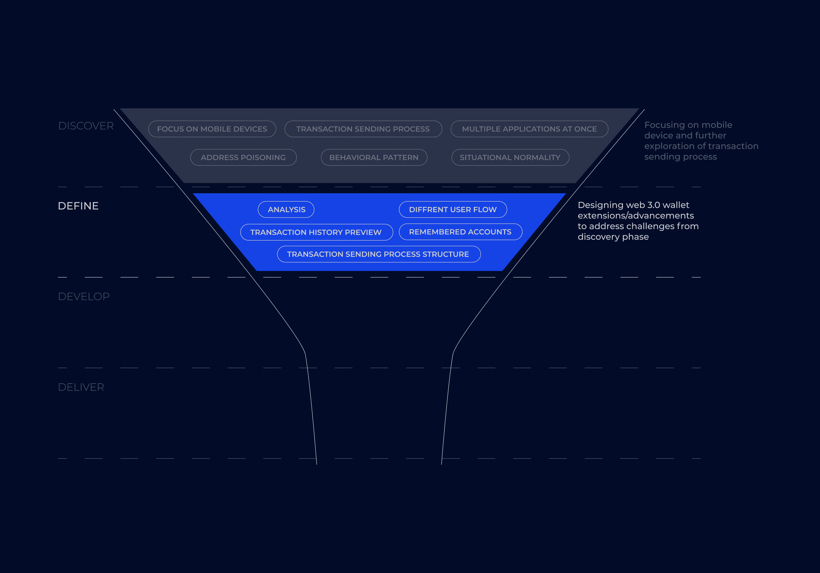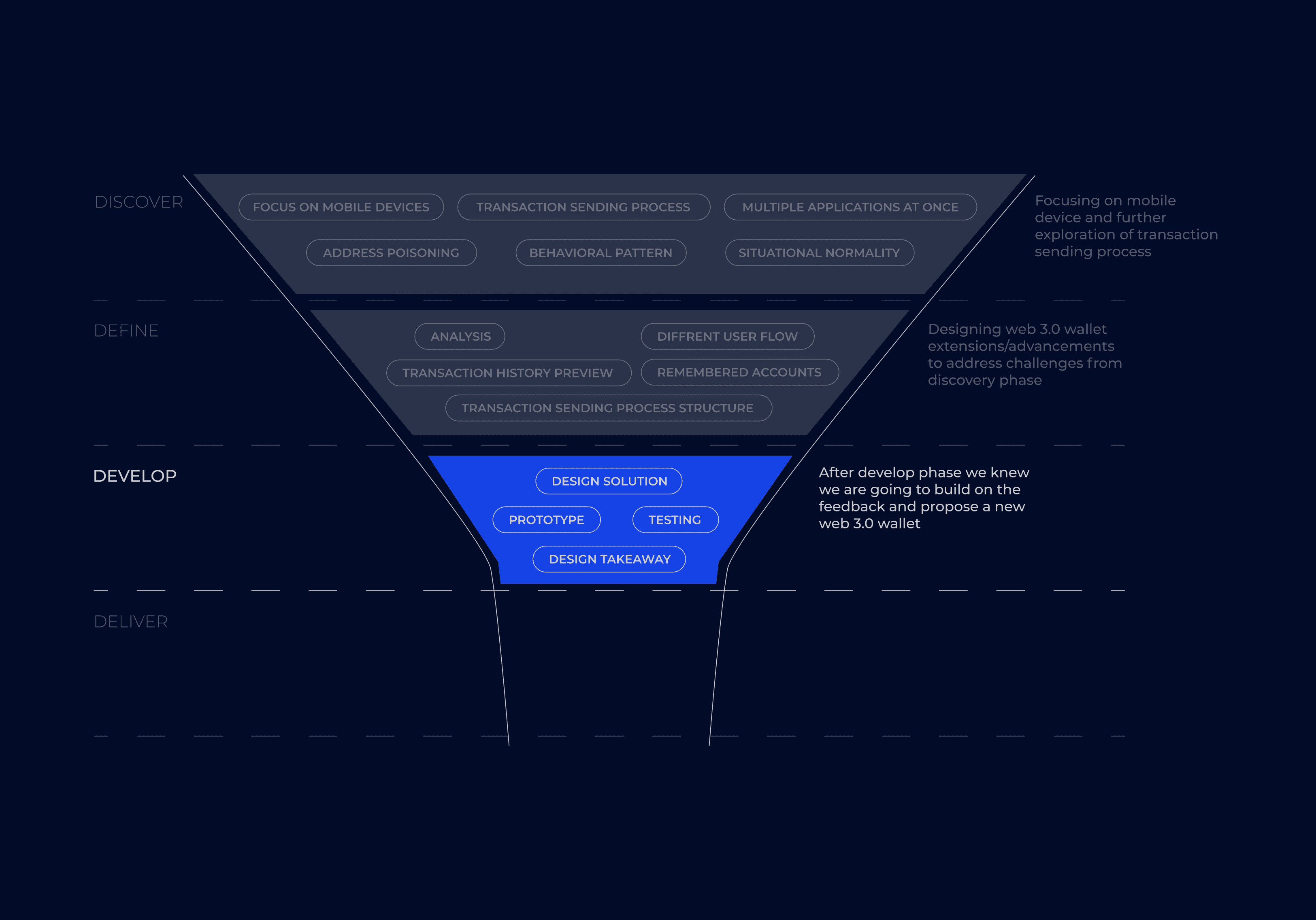 To address the challenges in the Web 3.0 space, I chose to use the Double Diamond design process, which is both easy to follow and effective. The process is divided into four key phases: Discover, Define, Develop, and Deliver.